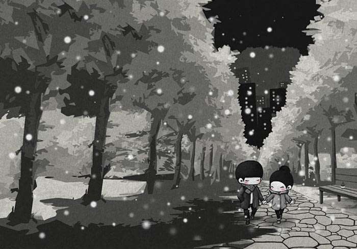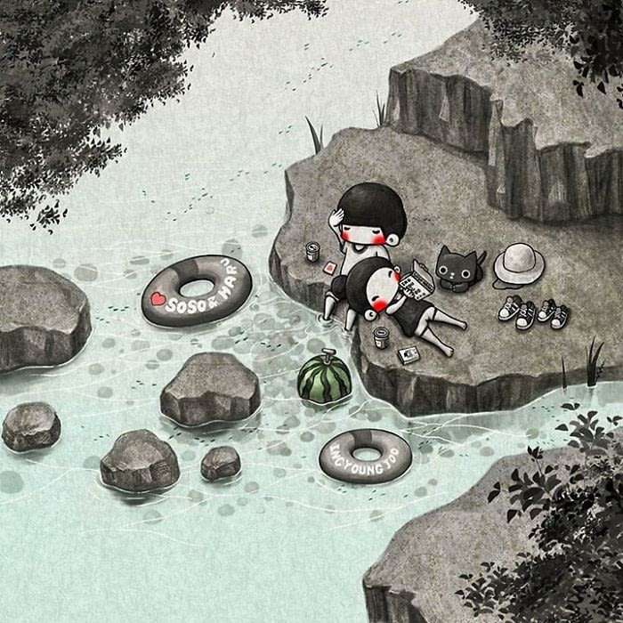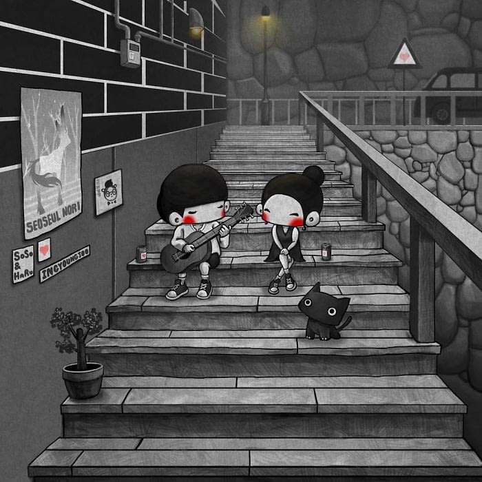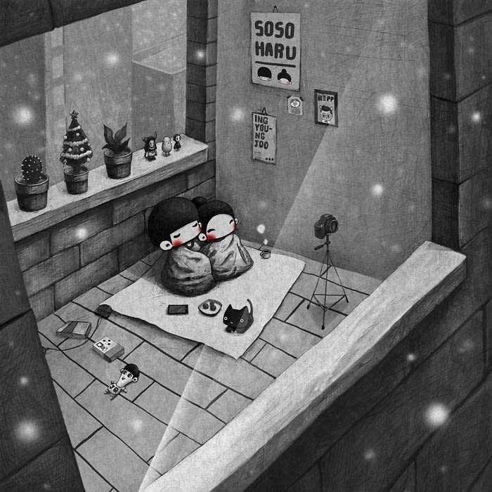 Young Joo Kim的插畫線條簡單,卻非常甜蜜。他沒有用太亮眼的顏色,反而用淡淡的灰色背景講述了最浪漫的愛情。遇到對的人,絕對不要放手啊~