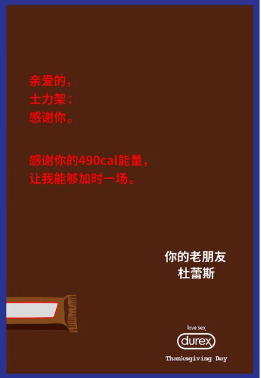 2018年01月27日每年11月最後一個星期四是感恩節,回到家中跟家人團聚,吃著火雞大餐,同時懷抱著感恩的心。去年保險套品牌,杜蕾斯就懷抱著「感恩的心,感謝有你~」的心情感謝各大品牌,不僅感謝各品牌,還順便將自己的商品行銷也包裝在裡面了!