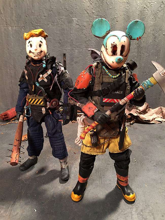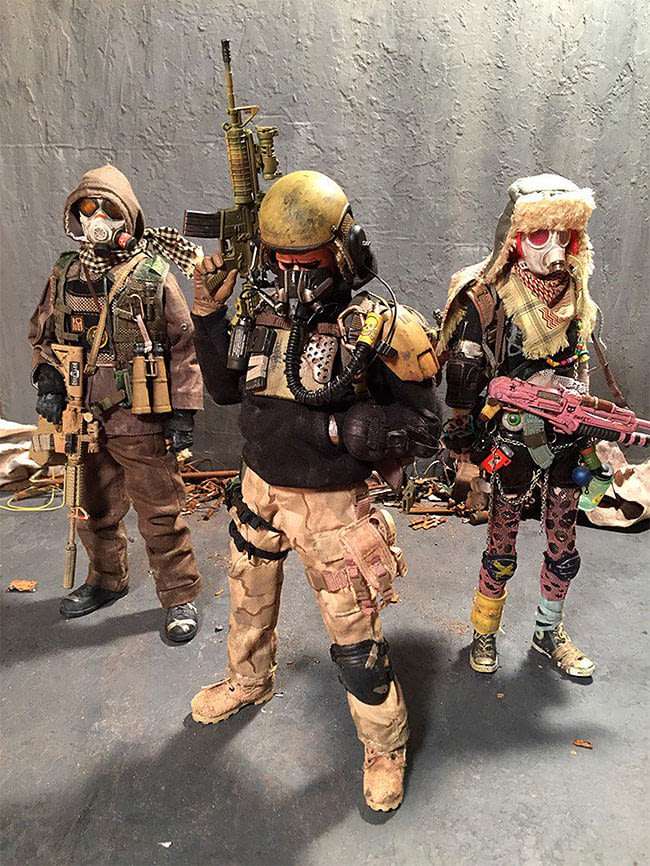 ▼他改裝了玩具的衣服、裝備,加上了防沙護目鏡、多口袋的擋風衣物、防幅射口罩頭盔等等。表面的塵垢污漬非常吸睛,讓人一下子想到絕望的沙漠。