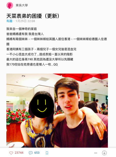 2018年01月31日如果你有一個超帥的表弟,還會害怕討厭家族聚會嗎?近日有女網友在Dcard上分享表弟的照片,混血的精緻外貌加上190公分身高,引發網友推爆,紛紛表示想「收服天菜帥哥,叫原PO一聲表姐」!