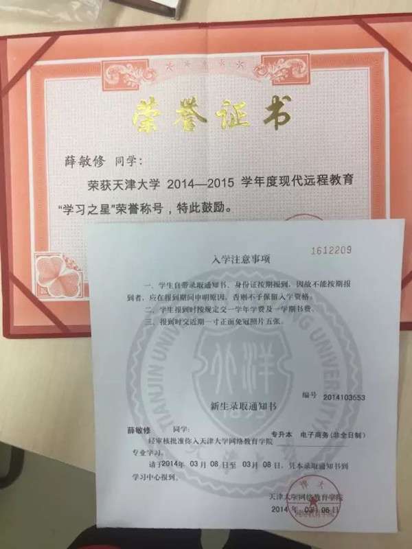 ▼上了大學後,薛敏修甚至是班上最用功的學生,教授指出她不但用2年時間就學完專業學分,且專業學分的平均成績接近100分!她也獲得天津大學「學習之星」的榮譽稱號,獎勵她的勤奮向學。
