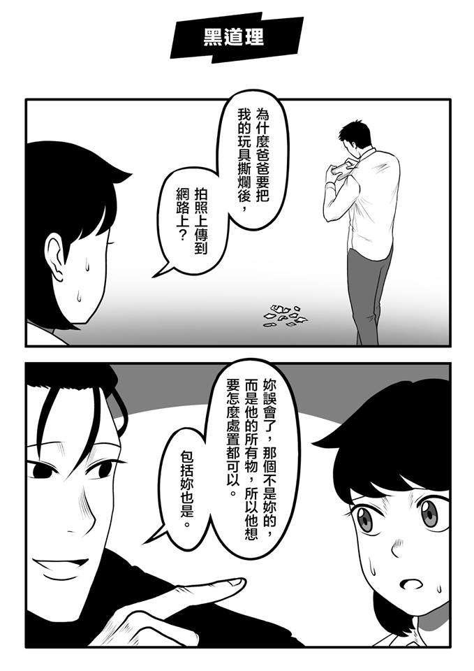 ▼網路畫家謝東霖不認同宥勝的教育方式,將「爸爸撕女兒玩具」的那一幕畫下來,還說:「妳誤會了,那個不是妳的,而是他的所有物,所以他想要怎麼處置都可以。包括妳也是。」