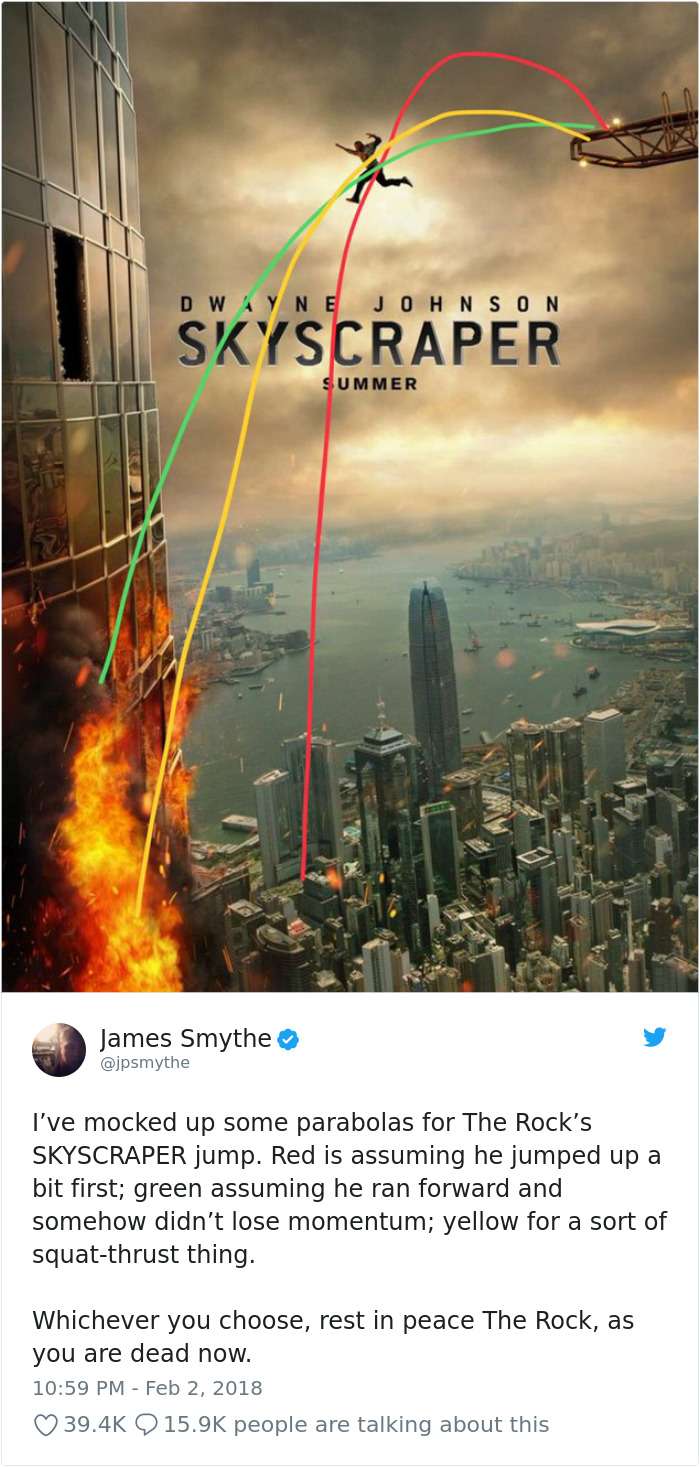 ▼網友們紛紛在海報上畫出合理的拋物線,認為無論如何巨石強森都無法抵達那棟大樓才對,「首先紅色的線是假設他有事先跳起;綠色線則是他直接向前疾跑然後不知為何沒有失去動量的情況;黃色線則是使用一些下蹲後促腿運動(Squat Thrust)的動線,無論他怎麼跳,他都死定了。」