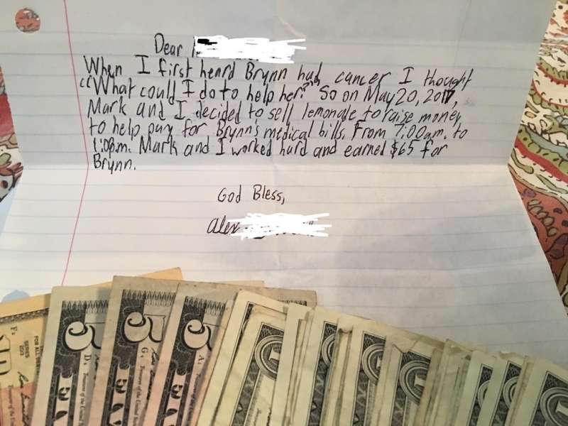 ▼信中夾著65美元(約新台幣2000元),上面寫著:「親愛的Brynn媽媽,我剛剛聽說Brynn罹癌時,忍不住問自己該如何幫她。所以在5月29日,我和Mark決定去賺點錢幫Brynn負擔醫藥費。從早上7點到下午1點,Mark跟我努力賣檸檬汁,賺到了65美元。願神保佑。」