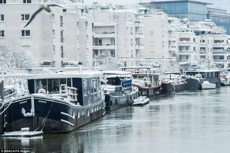 ▼塞納河邊的船被蒙上一層雪。