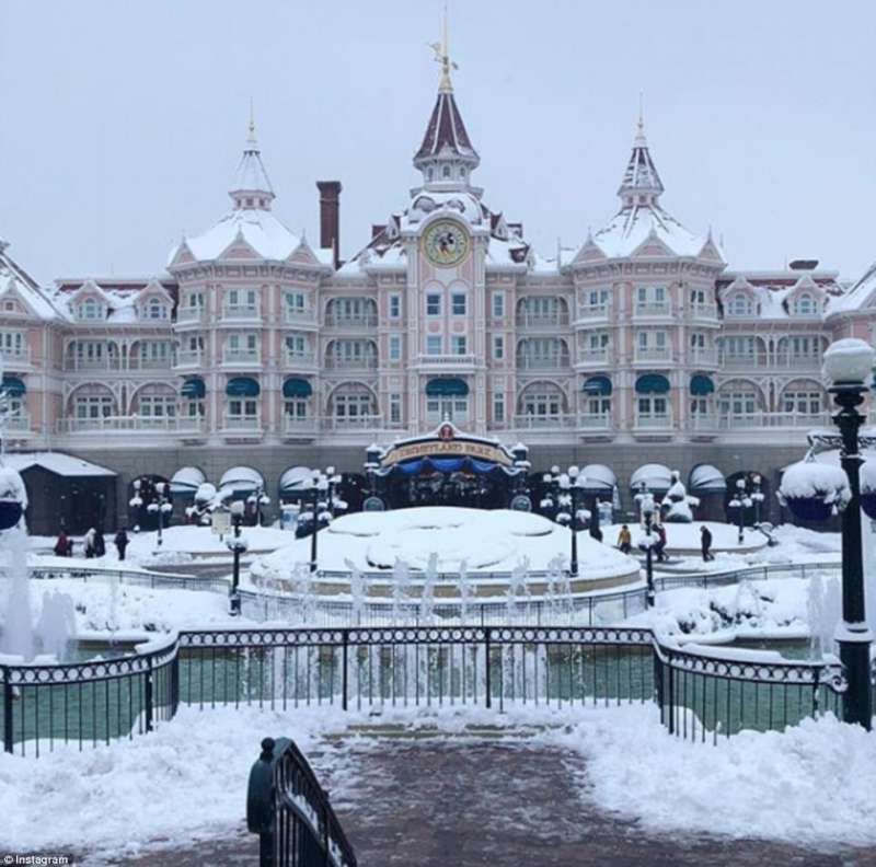 ▼巴黎的迪士尼樂園也被積雪覆蓋,粉紅色的城堡變成了白色。