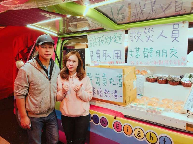 ▼這對小情侶在2月7日時眼見花蓮災情嚴重,決定下班之後也投入賑災物資補給的行列,在下午就直接開上蘇花公路前往花蓮,在現場提供免費的鐵板面、姜母茶的食物和飲料。