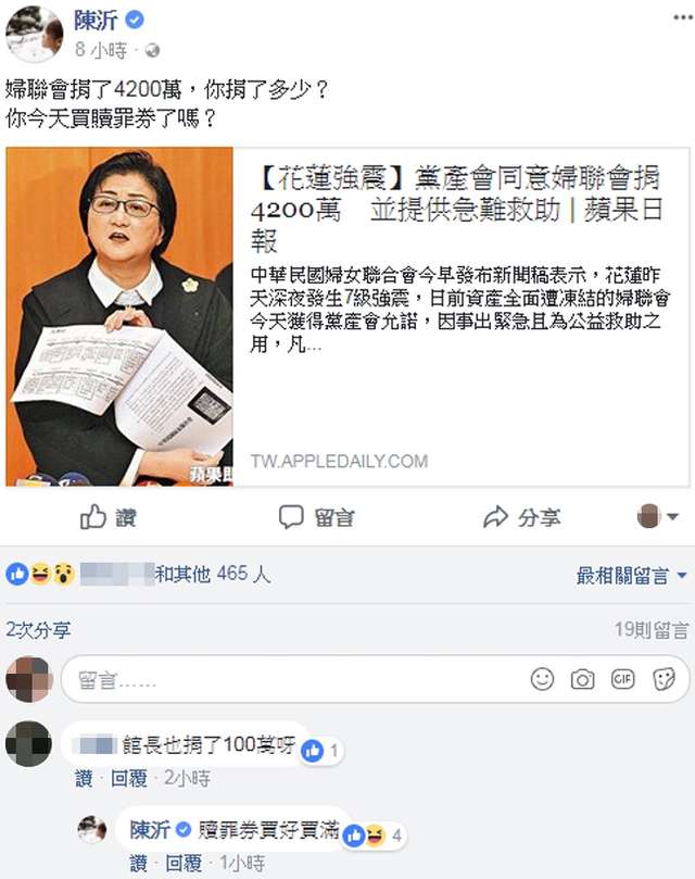 ▼原來陳沂在自己臉書分享了婦聯會捐款4200萬元的新聞,還寫道:「婦聯會捐了4200萬,你捐了多少?你今天買贖罪券了嗎?」有網友在底下留言表示館長也捐了100萬元,陳沂則回覆:「贖罪券買好買滿」,暗指婦聯會和館長捐款是為了贖罪。