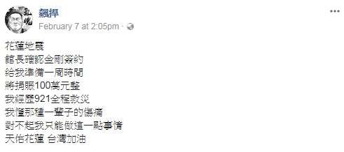 這次的花蓮強震造成非常嚴重的災情,全台善心人士紛紛出錢出力,獻出自己的一份心力。沒想到喜歡在臉書評論時事的話題人物陳沂又在這時候開炮,嘲諷館長捐款100萬是「贖罪券買好買滿」。