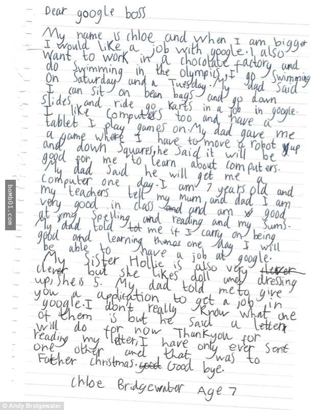 2018年02月15日你還記得自己小時候的夢想嗎?克洛伊(Chloe Bridgewater)是一名來自英國的7歲小女孩,不過年級小小的她卻有一個浩大的夢想,希望自己長大後可以進入Google這家大公司工作,甚至還誠意滿滿地親手寫了一封「求職信」,向「Google老闆」推薦她自己。