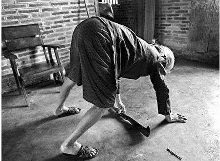 ▼她逃回家後被抓了回去,日軍就讓她扮「四腳牛」,來懲罰她。所謂「四腳牛」,就是日軍將刺刀倒插在地上,要她彎腰手腳著地,刺刀鋒利的刀刃剛好抵住她的腹部。如果敢抬頭,就會遭到日軍的棒打;但如果累了撐不住,就會被刀刃鑿穿腹部喪命。