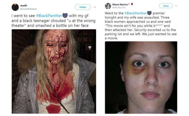 ▼最近,網路上出現了一些令人不安的照片。一些白人聲稱自己觀看《黑豹》過程中被年輕黑人襲擊,還有照片為證。