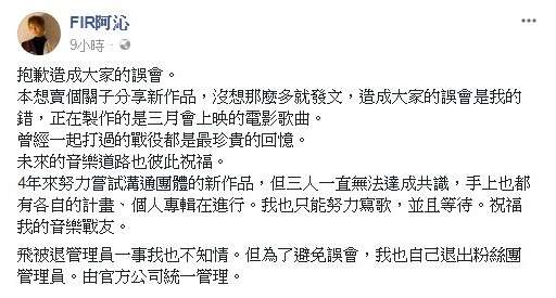 ▼另外一名成員阿沁也終於在臉書發文澄清,表示因為「4年來努力嘗試溝通團體的新作品,但三人一直無法達成共識,手上也都有各自的計畫、個人專輯在進行。」也指目前在錄製的是三月會上映的電影歌曲並不是F.I.R的新歌,「沒想那麼多就發文,造成大家的誤會是我的錯。」