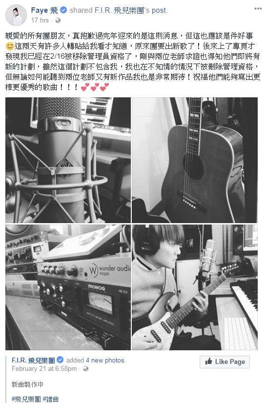 ▼飛於2月21日在自己的粉絲專頁發文表示,許多粉絲發現F.I.R的粉絲專頁分享了要推出新作品,目前在錄製新歌的消息,身為主唱的自己竟然毫不知情,是透過親友臉書轉帖才知道團體將要推出新歌。而她同時也發現,自己的F.I.R粉絲專頁的管理員資格,已經在16日被移除資格了。在她向其他兩位團員求證後,得知團體真的有新計劃,不過並不包括她。即時如此,她也在文末給予祝福:「無論如何能聽到兩位老師又有新作品我也是非常期待!祝福他們能夠寫出更棒更優秀的歌曲!」