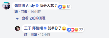 ▼貼文一出,前經紀人Andy立馬回覆:「我是天意?」,讓粉絲笑翻了!而王子也吐舌笑說:「就靠你了!」,似乎暗示了棒棒堂即將合體站上舞台。