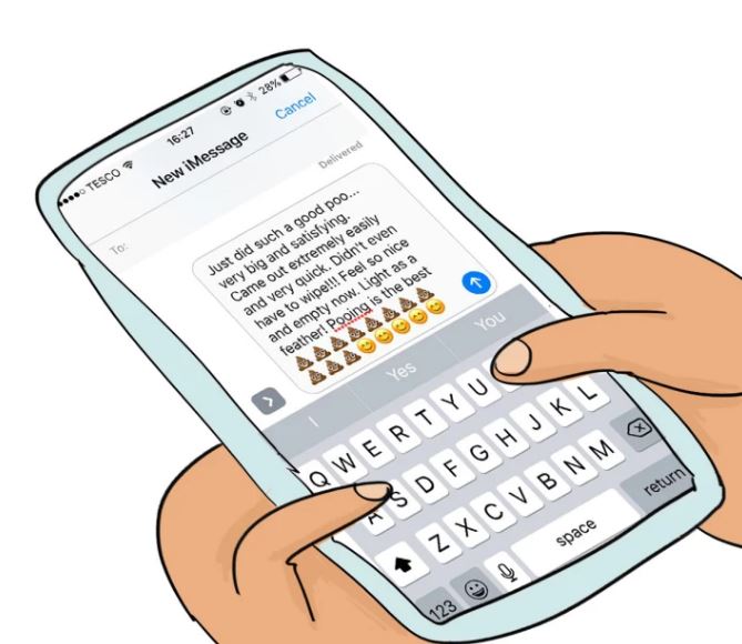 「剛拉出一個很不錯的便便……超大超滿足。它很容易就出來了,幾乎不用擦,感覺很好很空。現在身體就像羽毛一樣輕盈,便便好棒啊。」