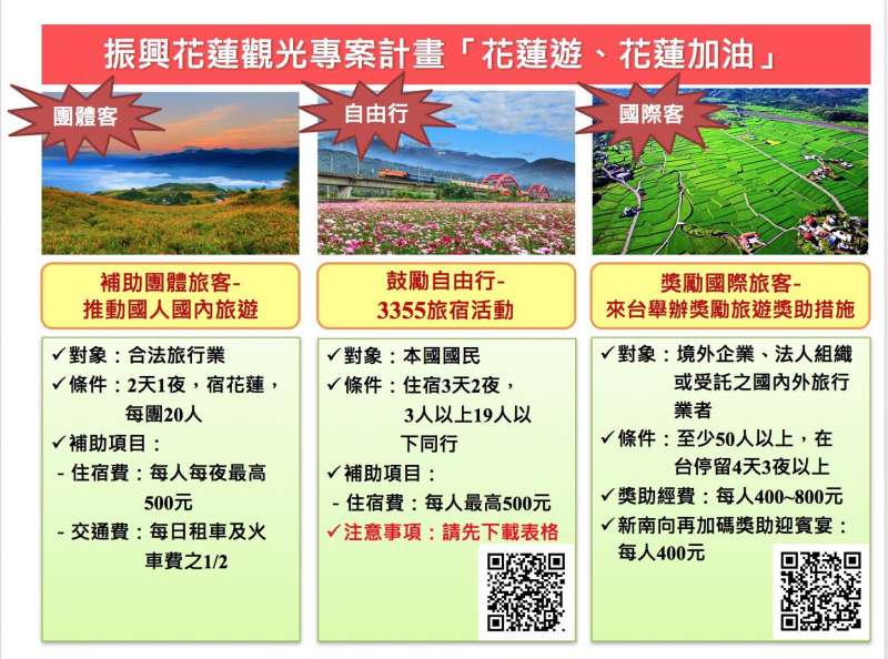 2018年03月07日由於2月6日的花蓮大地震讓當地旅遊業受到重創,觀光局為了鼓勵國人到花蓮旅遊,宣佈推出「3355」自由行專案,給予每人最高500元的住宿補助!