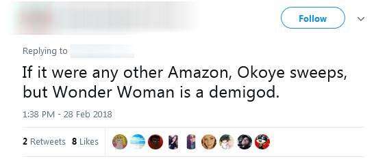 ▼參與話題的網友都認為,神力女超人的贏面比較大:「我不會參與『神力女超人 vs Okoye』的話題,不過記得WW甚至可以痛揍超人一頓啊。」