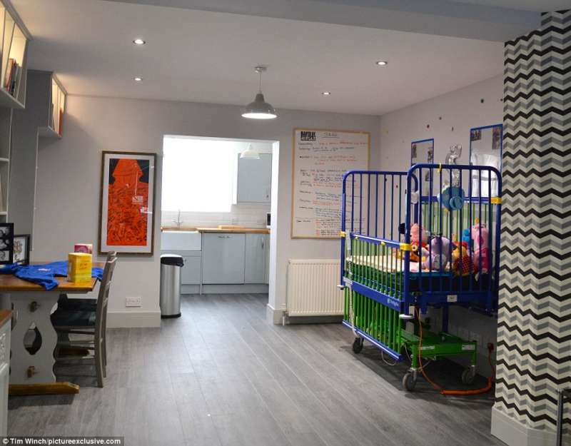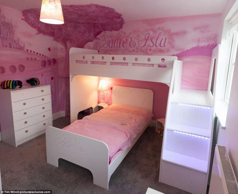 ▼他們也在大女兒的房間加裝了一個小床,讓這對姐妹能夠一起住在這個房間內。為了照顧到薩迪的呼吸系統疾病,他們採用了超貴的環保塗料,確保這些材料、油漆不會對薩迪造成影響。