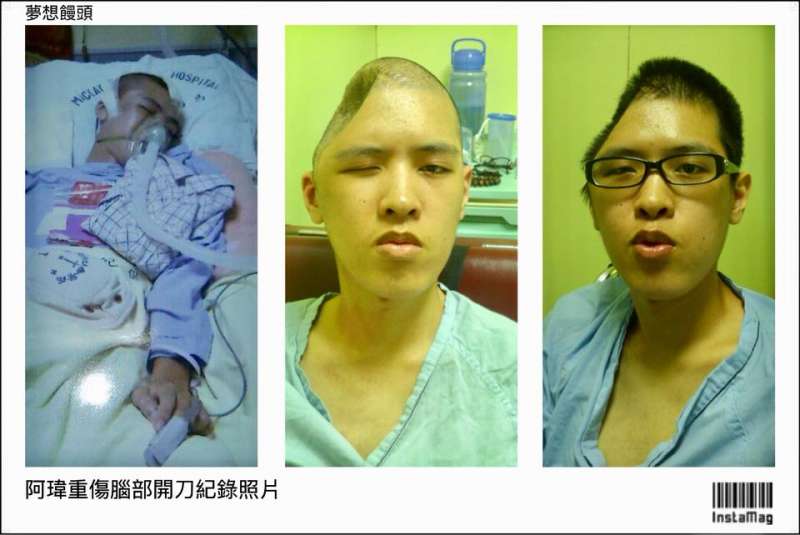 ▼2012年5月一個晚上,阿瑋好好地走在斑馬線上,卻被酒駕機車騎士撞飛。這一撞擊後果相當慘烈,他的半邊頭骨碎裂。送到醫院一息尚存,但開刀後仍無法復原。醫生和阿瑋的爸爸說:「再開一次刀的話,一半機率會成為植物人,一半機率會離開」,爸爸聽了相當恐慌,仍假裝鎮定地回覆:「醫生您別再開刀了,就讓阿瑋自己堅持吧。」內心拼命祈禱上天可以重新給阿瑋一次機會 。
