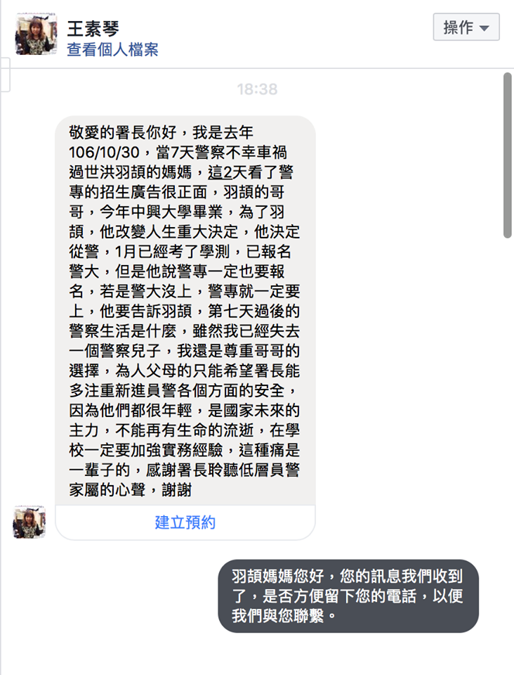 ▼最近,NPA署長室卻意外收到洪媽碼的留言,表示洪羽頡的哥哥今年中興大學剛畢業,但決定報考警大,「他要告訴羽頡,第七天過後的警察生活是什麼,雖然我已經失去一個警察兒子,我還是尊重哥哥的選擇。」她也希望署長能多多重視基層警員安全,因為家屬失去他們的痛是一輩子的。