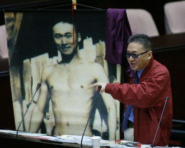 ▼當上立委後,李敖不改大砲個性,在質詢行政院長蘇貞昌有關軍購案時,直接拿出自己的放大版裸照抗議,嚇得立法院裡頭一眾女立委等人花容失色。