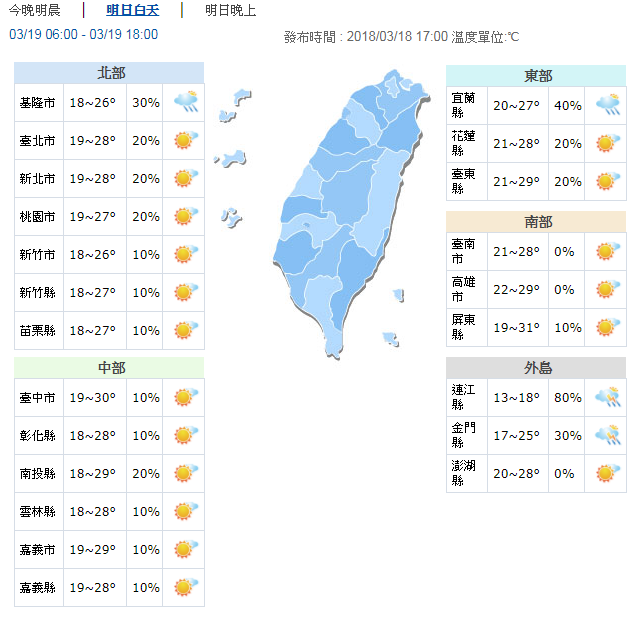 ▼氣象達人彭啟明指出,星期一(19日)仍然是穩定的好天氣,全台各地白天都非常溫暖,市區內及中南部甚至可能稍熱,到了晚間鋒面系統逐漸接近將導致西半部地區漸轉短暫陣雨或雷雨天氣。