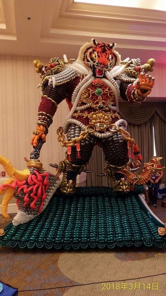 ▼世界氣球大賽比賽共有十項,包括櫥窗展示、氣球柱、造型氣球、氣球帽、外送造型、外送花束、大型雕塑作品、中型雕塑作品、嘉年華服裝和桌上型擺飾。這一次何坤龍率領中港台、新加坡、馬來西亞、泰國共28位氣球好手,使用超過5萬多條氣球合力製作出大型作品「虎將軍」,可謂栩栩如生。