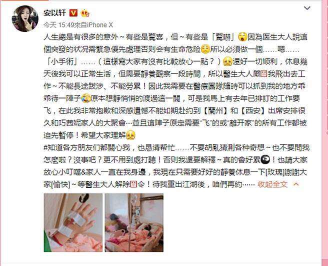 ▼安以軒還分享了兩張照片,表示自己被醫生判斷出突發狀況需優先處理,否則會有生命危險,經過一個緊急的「小手術」,目前已經安全順利,可是仍然需要靜養一段時間。