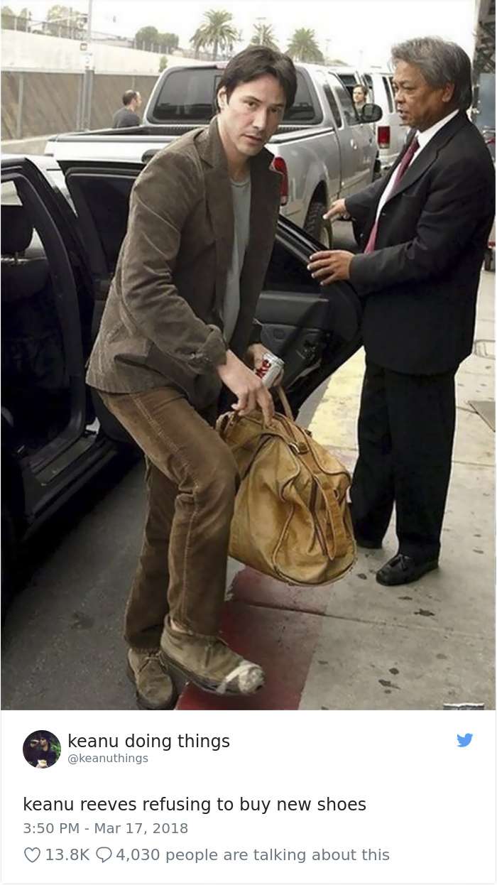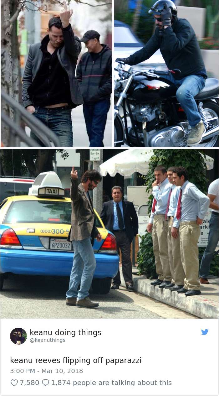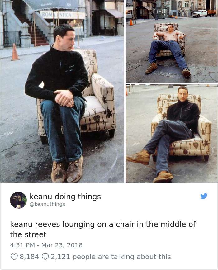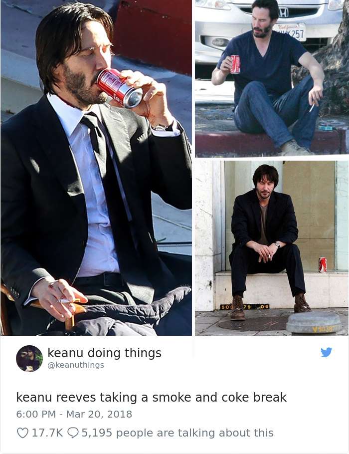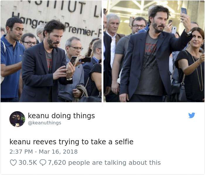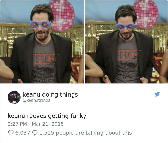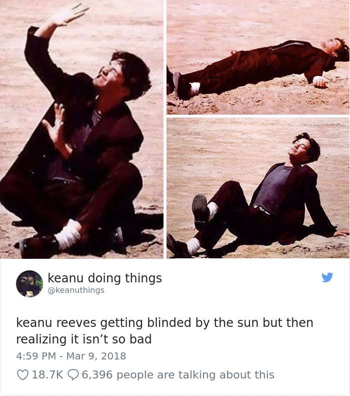 2018年04月01日基努李維(Keanu Reeves)是許多人心目中的男神,他的一舉一動也經常受到媒體的關注。有網友將他平常的舉動,配上廢到令人噴笑的旁白,上傳到「keanu doing things」的推特上,一起來看看網友到底多麼有創意和幽默感吧: