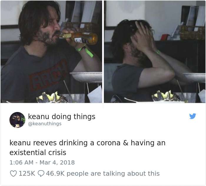 ▼基努李維喝了Corona啤酒之後開始懷疑自己的存在。