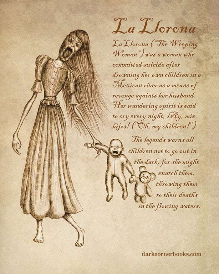 ▼「La Llorona」(哭泣的女人):一名女子為了報復丈夫,將自己的孩子扔進墨西哥河中溺死,然後自殺。牠遊蕩的鬼魂每晚都會哭喊:「我的孩子們!」傳說中,孩子晚上出門會被牠抓住,扔進水中溺亡。