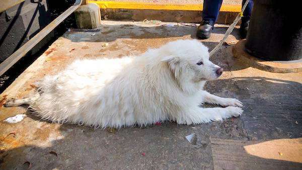 ▼獲救時,狐狸犬還乖乖在原地等待主人,殊不知幾天後發生驟變。4天後的清晨,長沙灣一棟大廈聽到巨響,住戶報警後,警方到現場調查,發現是有一隻白色狐狸犬被推下天井,當場分屍慘死。