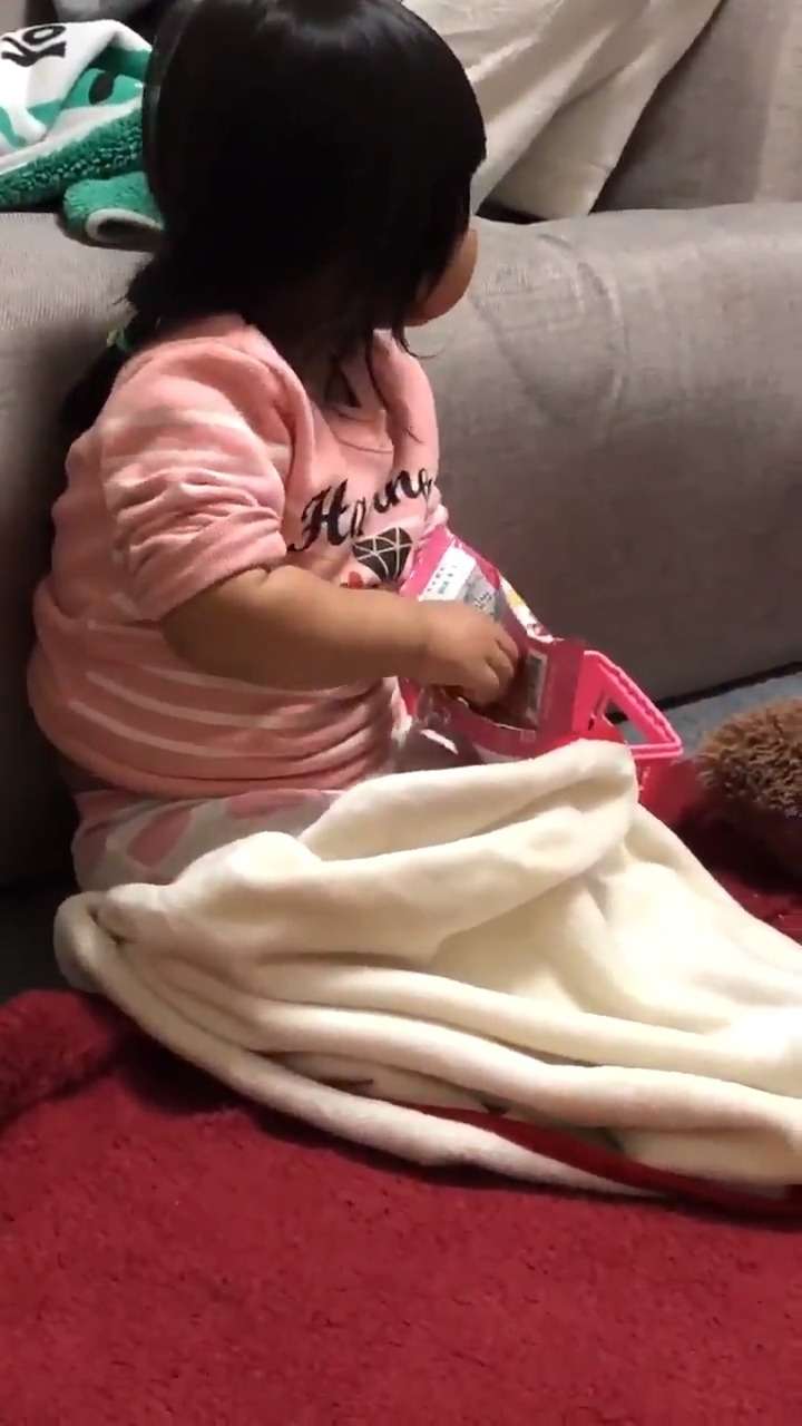 ▼「吃貨」女兒為了不讓家長發現自己偷吃零食,悄悄地把零食袋子藏在毯子底下,在觀察四周沒有人發現時伸出了「罪惡的小手」,但這「心虛的小眼神」已經出賣了她。