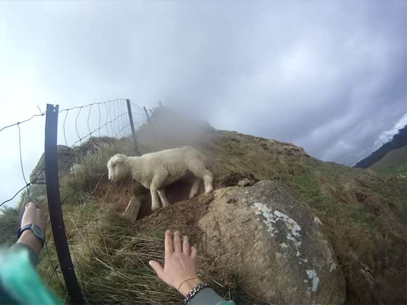 這是一隻在紐西蘭的小羊,這天不知不覺在吃草時就走到高聳的半山腰,而且還不小心把頭穿過防護網,卡在中間無法前進也無法後退,中間還試圖要往前衝過鐵網,但網子實在是塞不過去。