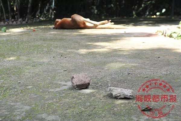 ▼母袋鼠死後沒幾天,飼育員又發現有遊客朝裡頭丟石塊,這次被砸的是5歲的公袋鼠,但因為牠行動比較敏捷,才僥倖避過石塊的攻擊,可是也受了一些傷。