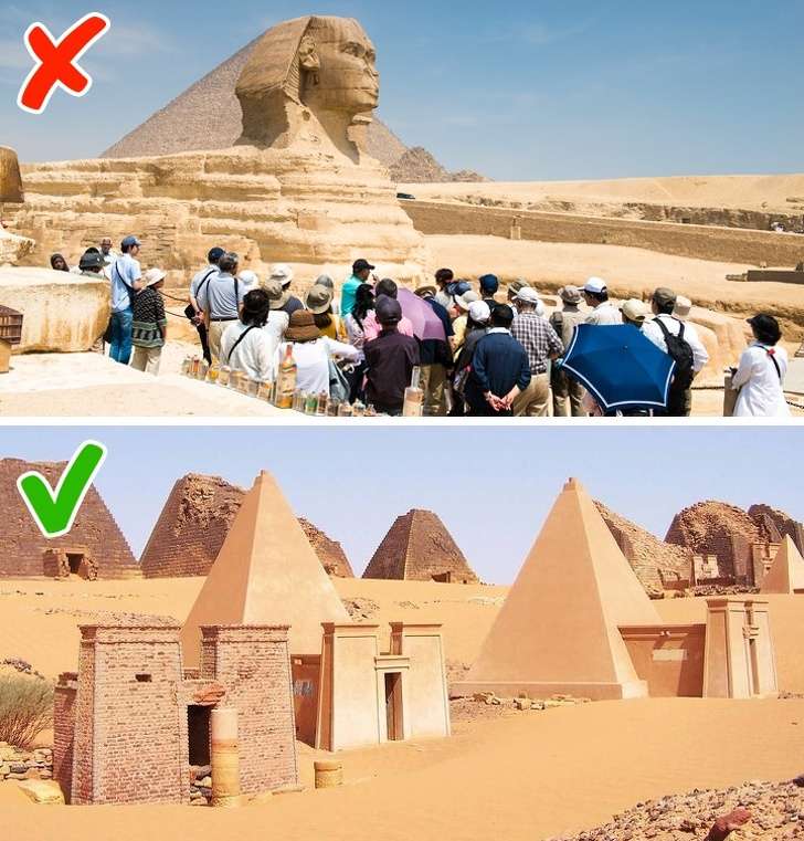 ▼埃及,古夫金字塔 vs 蘇丹,美羅埃金字塔:去埃及金字塔,必須忍受悶熱的巴士、酷熱的天氣、超高的物價。蘇丹的美羅埃金字塔就好多了,它位於尼羅河東岸,是古代城市的遺跡,遊客不多,價格不高,但非常壯觀。