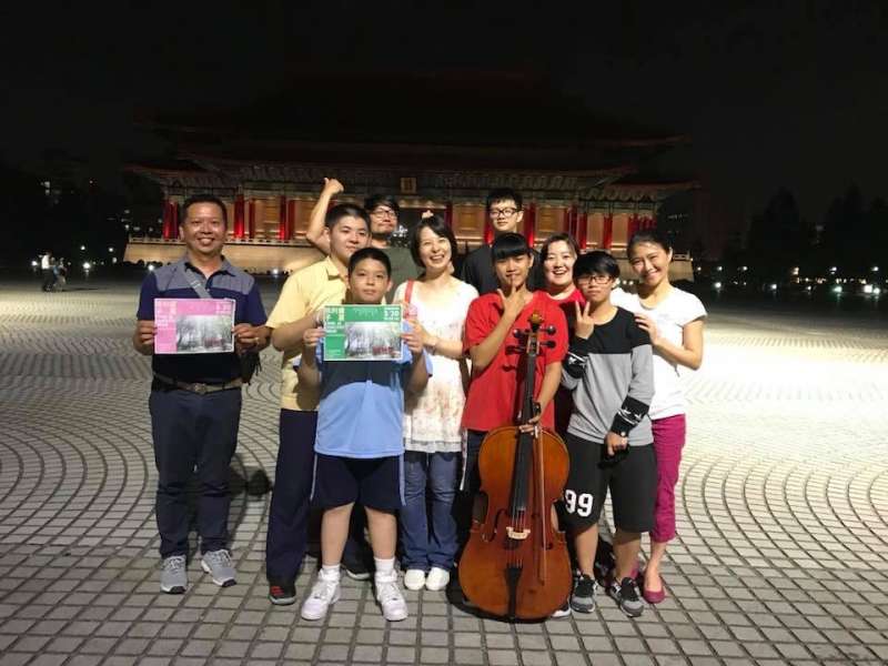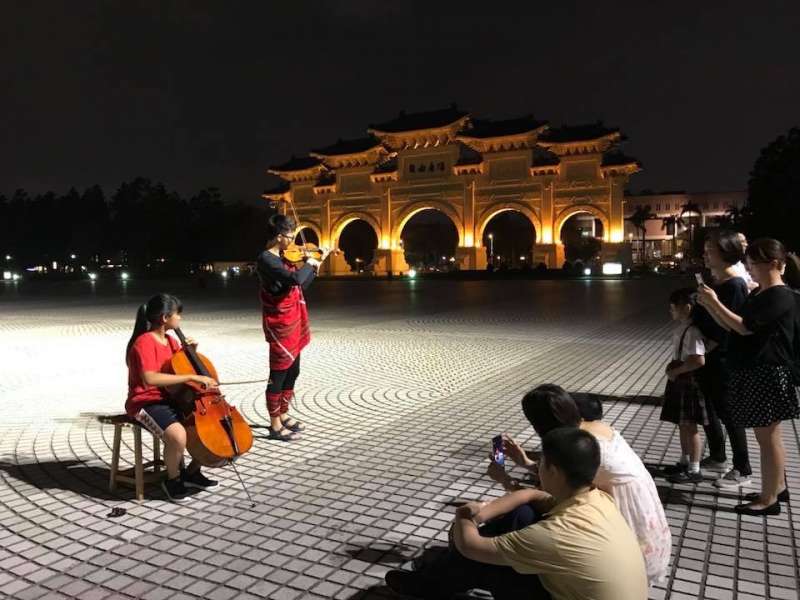 ▼5月16日晚間,樂團成員曾詩芸和洪梓峰還帶著樂器夜衝中正紀念堂廣場,進行快閃演出吸引對音樂有興趣的民眾可以撥出時間購票來欣賞他們的演出。
