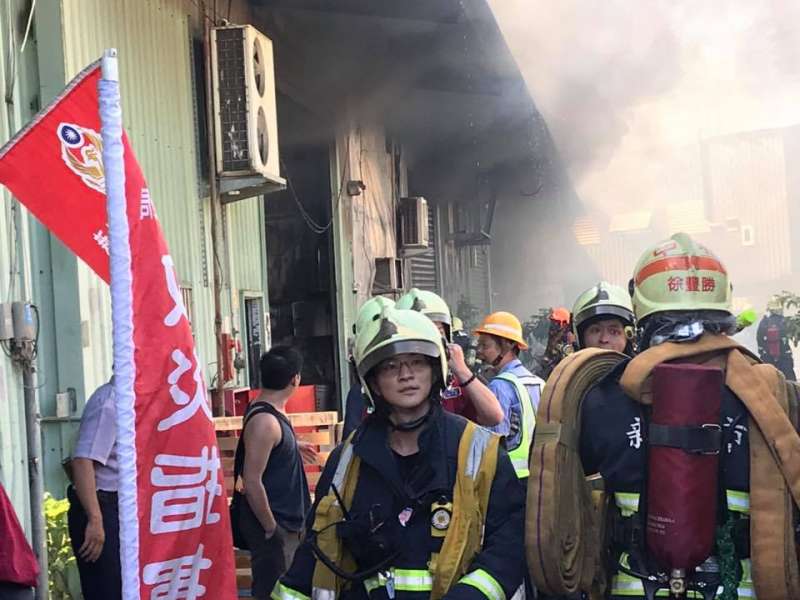 ▼中和區莒光路上一間連棟鐵皮工廠因為存放了許多易燃物品,後來演變成火災。消防員頂著火場的高溫,在高達9級的紫外線指數下,輪班打火5個多小時,終於將大火撲滅。現場沒有人員傷亡,詳細的起火原因還需要進一步調查。