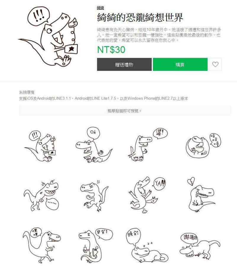▼雖然綺綺永遠地離開了,但是她卻給世界留下溫暖的貼圖。綺綺的乾媽具有視覺藝術的專長,於是自願幫忙將綺綺的日常繪畫製作成貼圖上架。她說:「綺綺爸媽決定,貼圖販售所得,除掉給Line和Google的行政費用外,其他均捐給兒童心臟病基金會,貼補一些經濟能力不佳的病人,開刀所需自費醫材的短缺。當然,貼圖的收入不可能很多。我們是希望世人不要忘記這個奇特的小女生,她的愛會藉由這些貼圖的存在,一直流傳下去。」