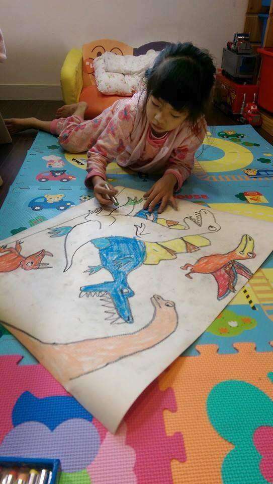 ▼那天起,綺綺就會把畫作中的恐龍當成是自己。施景中記得很多她畫的內容,像是恐龍媽媽正在教訓小恐龍、小恐龍掉頭髮掉牙齒…這些都是綺綺和爸爸媽媽的日常。