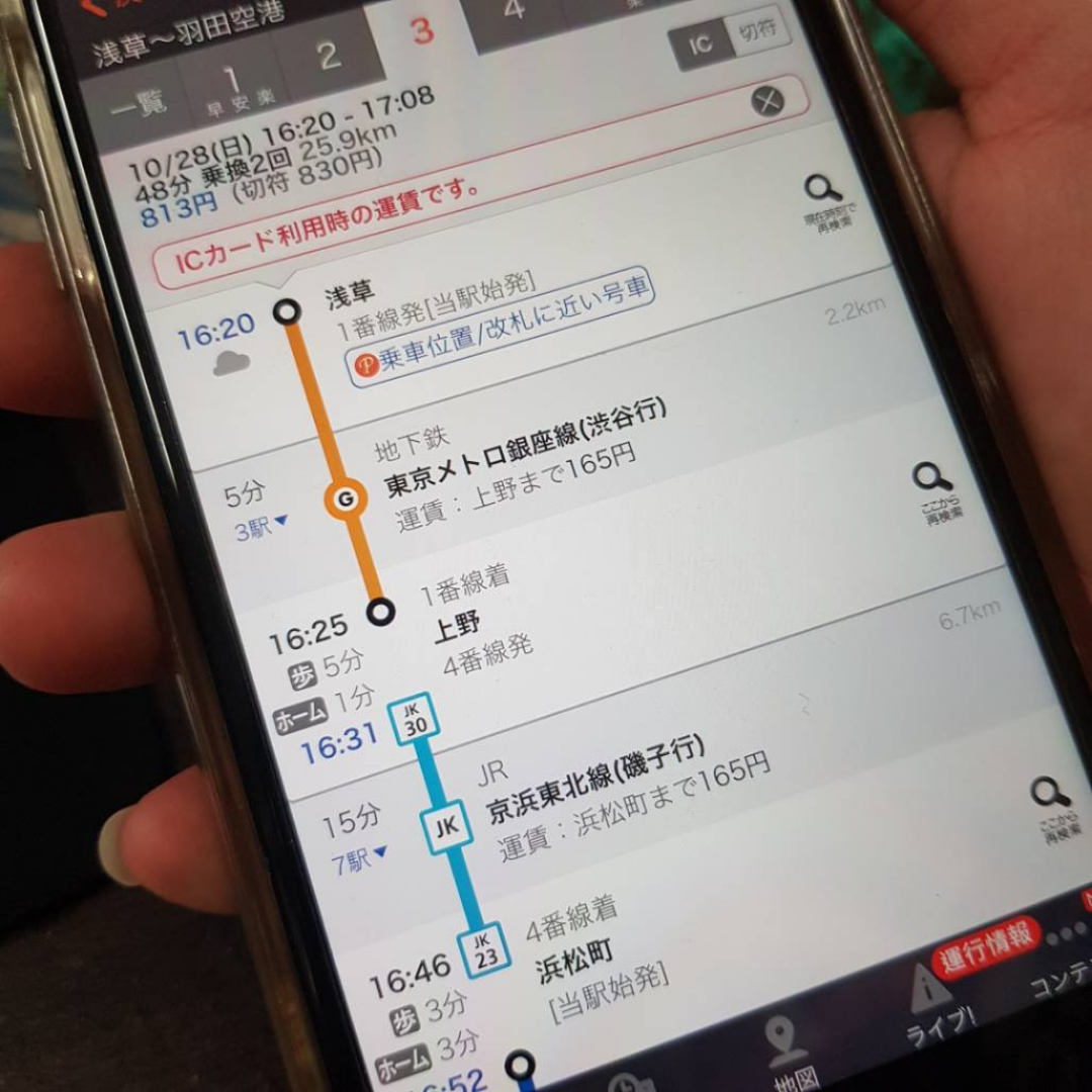 對於許多自由行旅客經常使用的就是手機的「乘換案內」APP,因為真的很方便,只要簡單輸入目的地,畫面就會顯示哪裡上車、哪個站轉車,幾乎一目了然。但是,缺點就是APP是無法即時通知列車誤點情況,遇到誤點情形就會與APP城市顯示的不同囉!