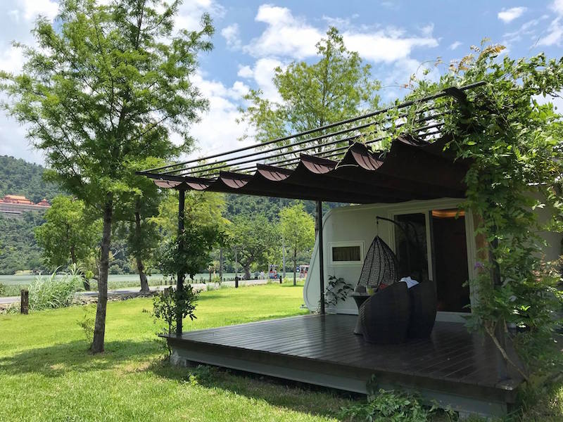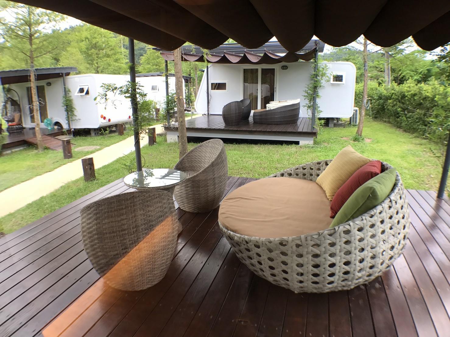 ▼每台露營車旁邊都有一處室外空間,這個平台擁有遮陽的屋頂,坐在屋外欣賞風景實在是人生一大樂事。