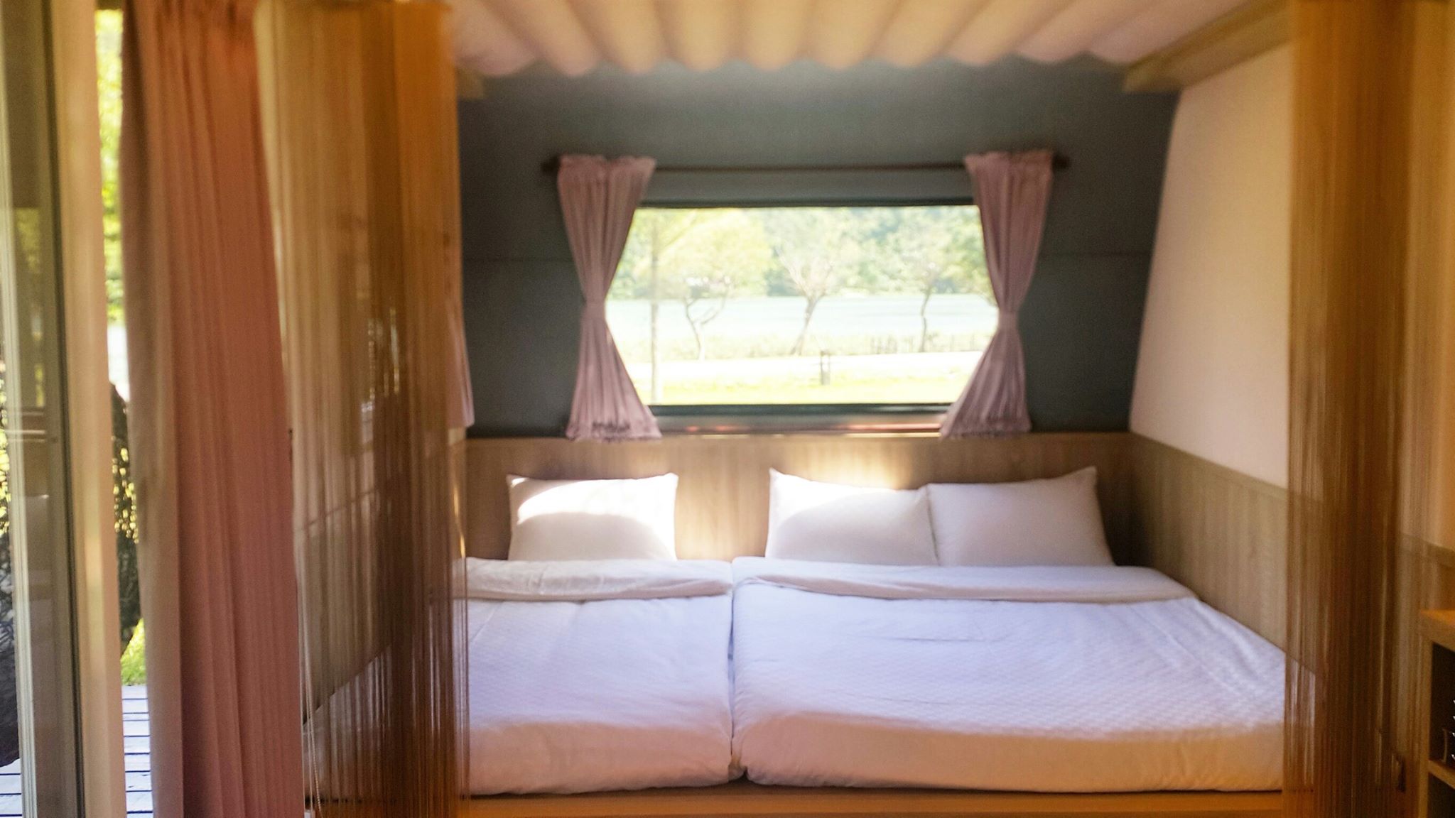 ▼露營車的房間內設有通鋪式的大床,適合一家大小共同入住。而且不僅擁有沙發、電視、獨立衛浴等設施,床鋪上方還留有一扇天窗,晚上躺在床上看星星實在太夢幻了!