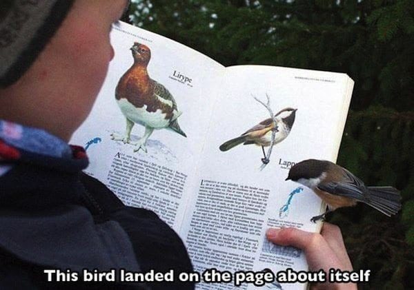 ▼他在看鳥類百科全書,一隻鳥停在了屬於自己的那一頁上。