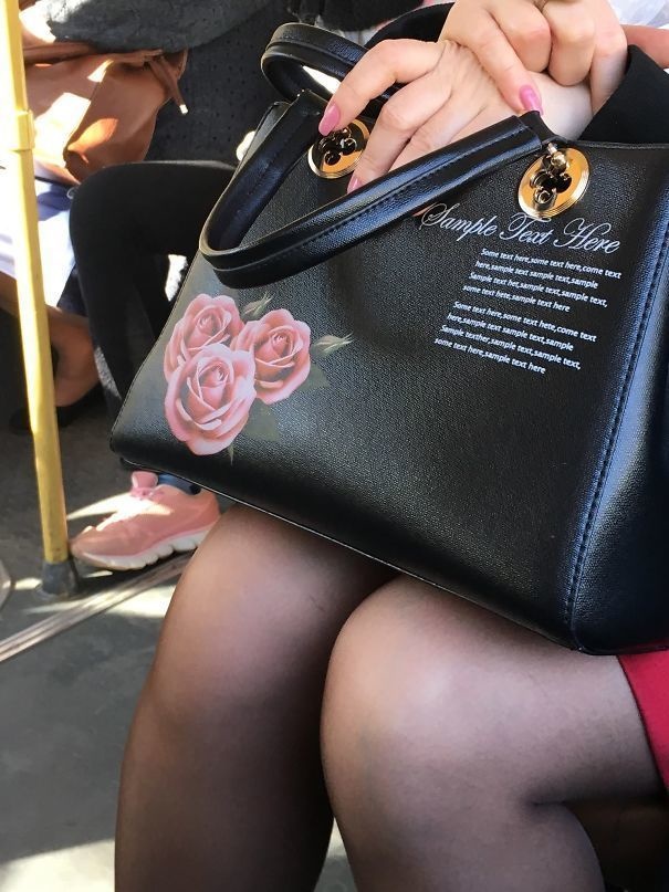 ▼包包上的字:「Sample Text Here(在這裡輸入樣本文字)。」