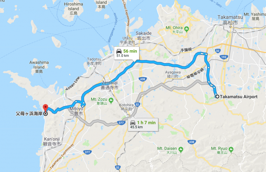 ▼要如何前往父母濱呢?最方便的當然就是自駕了,從高松機場出發的話車程不到一個小時。你也可以選擇搭乘JR,在JR予讚線 詫間站轉乘巴士仁尾綫,約 25 分鐘後就可以抵達父母濱。