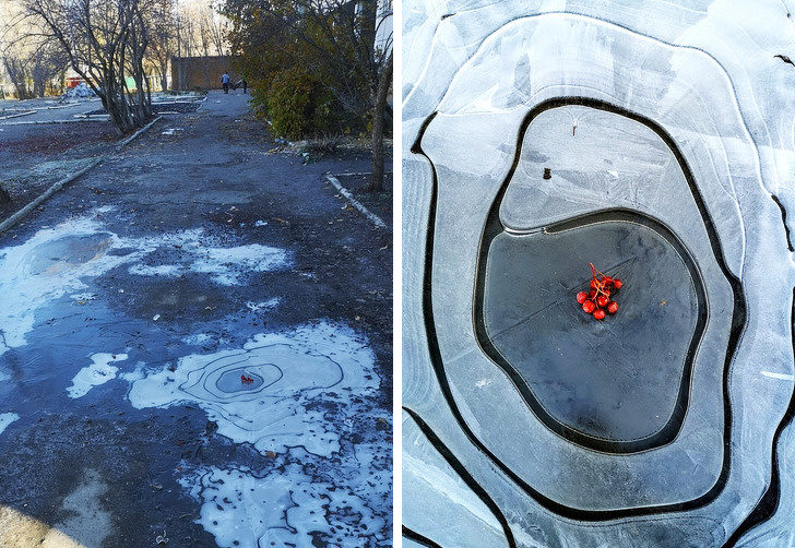 ▼路上結冰的水坑,變成了禪意十足的藝術。