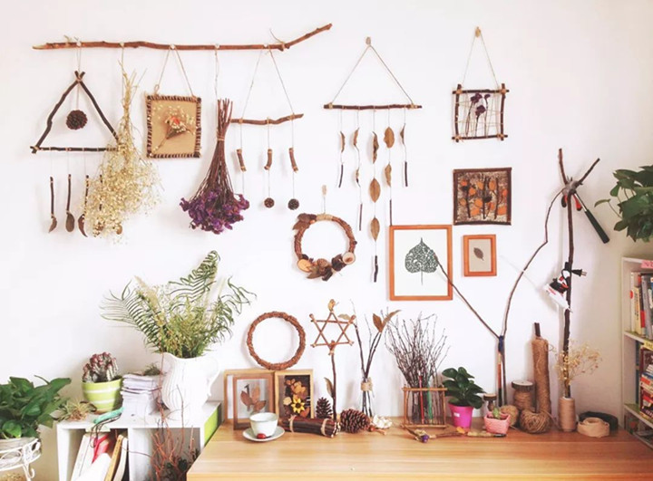 ▼她還會隨手撿一些枯樹枝、落葉、苔蘚、松果和鮮花等帶回家,一開始只是隨意將它們組合一下,沒想到竟然格外的好看,因為設計的功底加上對美感的敏銳,她開始嘗試著將它們做成不同的造型,在她的手下這些枯枝敗葉仿佛獲得了新生,有了新的意義,而沉浸在創作的快感中,也讓她忘記了曾經追夢的挫敗感。