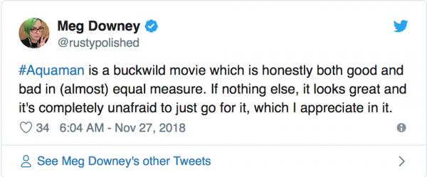 ▼「感恩節之前看了《水行俠》,用了一個星期的時間仔細回想。雖然這是一部有瑕疵的電影,但是非常有趣。男女主角絕對是選對人了!最重要的是,這部電影從頭到尾都超震撼,我真的被電影裡的創意和瘋狂震驚了。我還要再看一次!」
